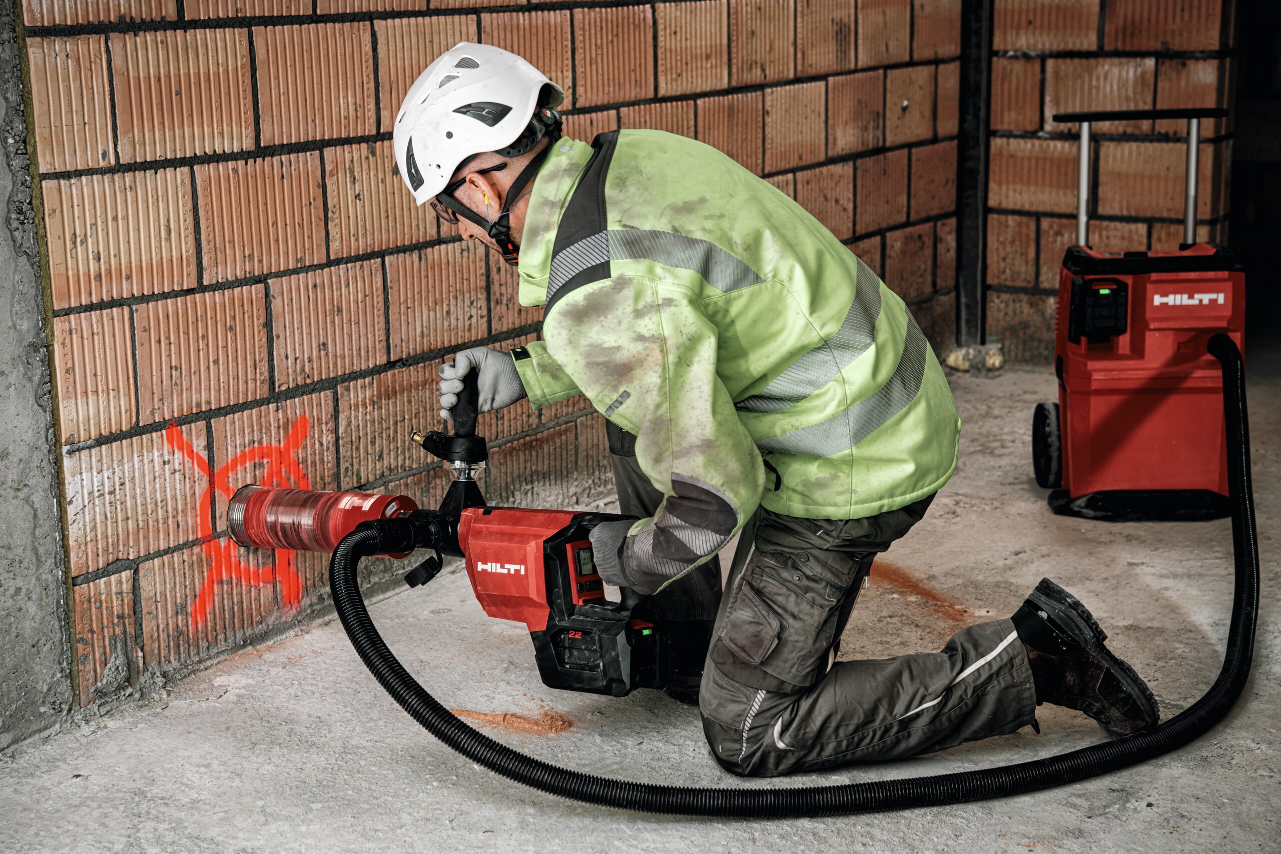 Zmniejsz narażenie na pył podczas wiercenia na sucho w murze dzięki naszemu zintegrowanemu systemowi usuwania pyłu (DRS) – dostępnemu z wiertnicą DD 150-U i ze wszystkimi naszymi wiertnicami akumulatorowymi