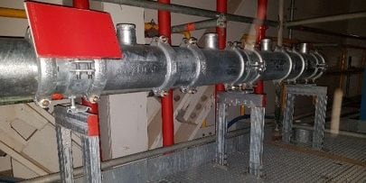 - Instalacja kanalizacji przemysłowej w obiektach kotłowni i maszynowni. Ciężkie żeliwne rury mocowane do konstrukcji stalowej i stropu żelbetowego