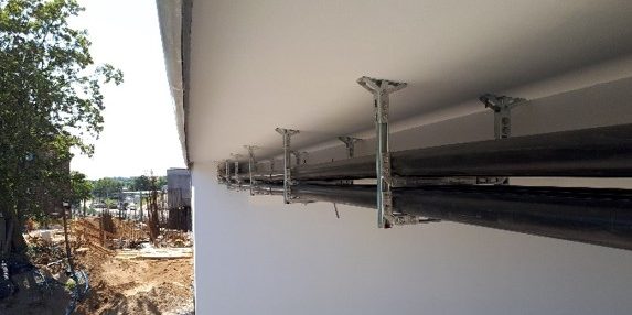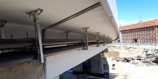 Ramy wsporcze dla rur HDPE wypełnionych przewodami elektrycznymi – szyny systemu MQ –F w ocynku ogniowym oraz specjalne stopy MQP-G F niwelujące kąt nachylenia wiaduktu.