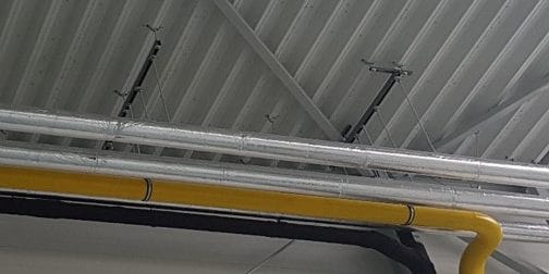 - Podwieszenia instalacji ogrzewczej oraz gazu – System instalacyjny MQ w tym klamry dźwigarów umożliwiające bezpośredni montaż do konstrukcji stalowej hali bez naruszania jej nośności oraz powłok antykorozyjnych. Łączniki oczkowe przegubowe MPSG umożliwiające wydłużenia rur w sposób kontrolowany i bezpieczny.