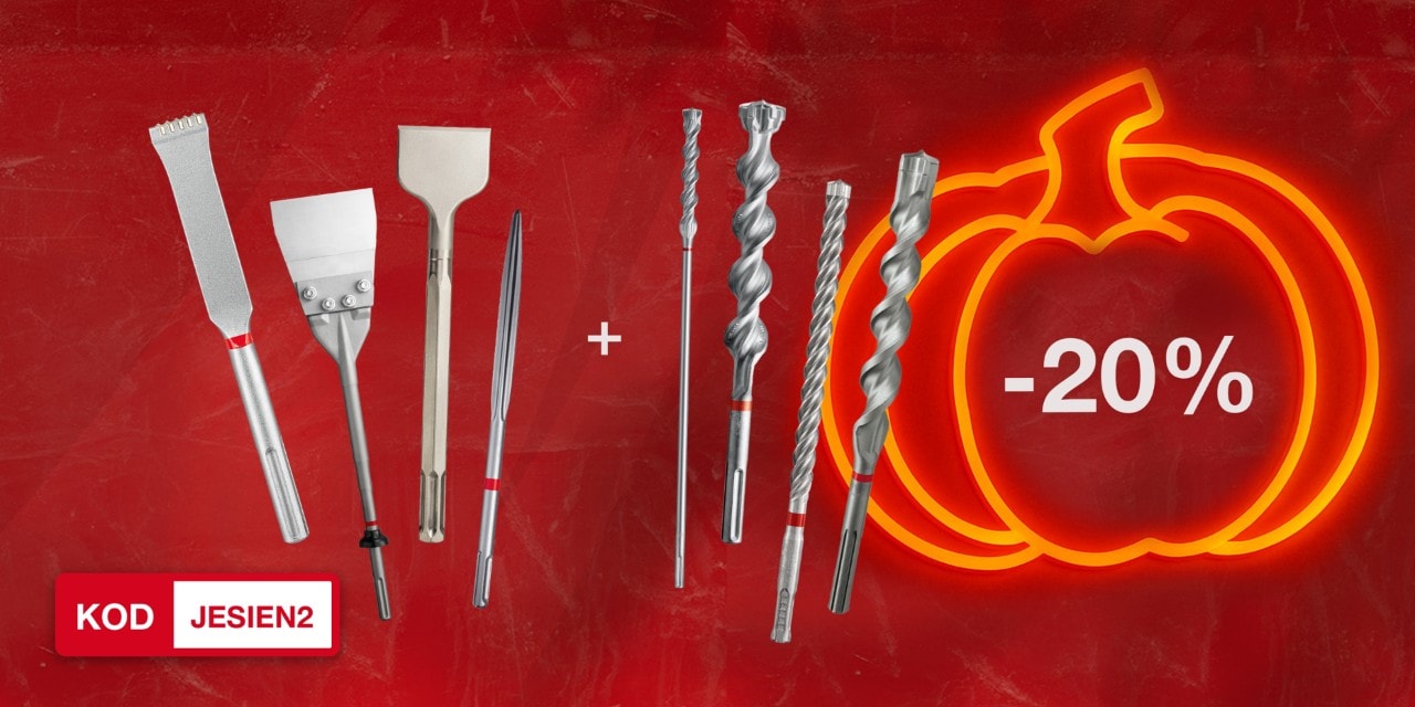 Użyj kodu JESIEN2 przy składaniu zamówienia, aby otrzymać 20% rabatu przy minimalnym wydatku 1500 PLN netto na wiertła i dłuta do betonu.